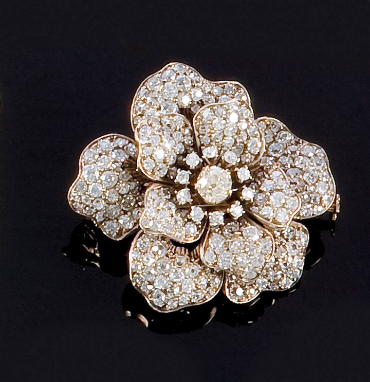 Spilla in oro giallo a forma di rosa con al centro diamante taglio brillante di vecchio taglio