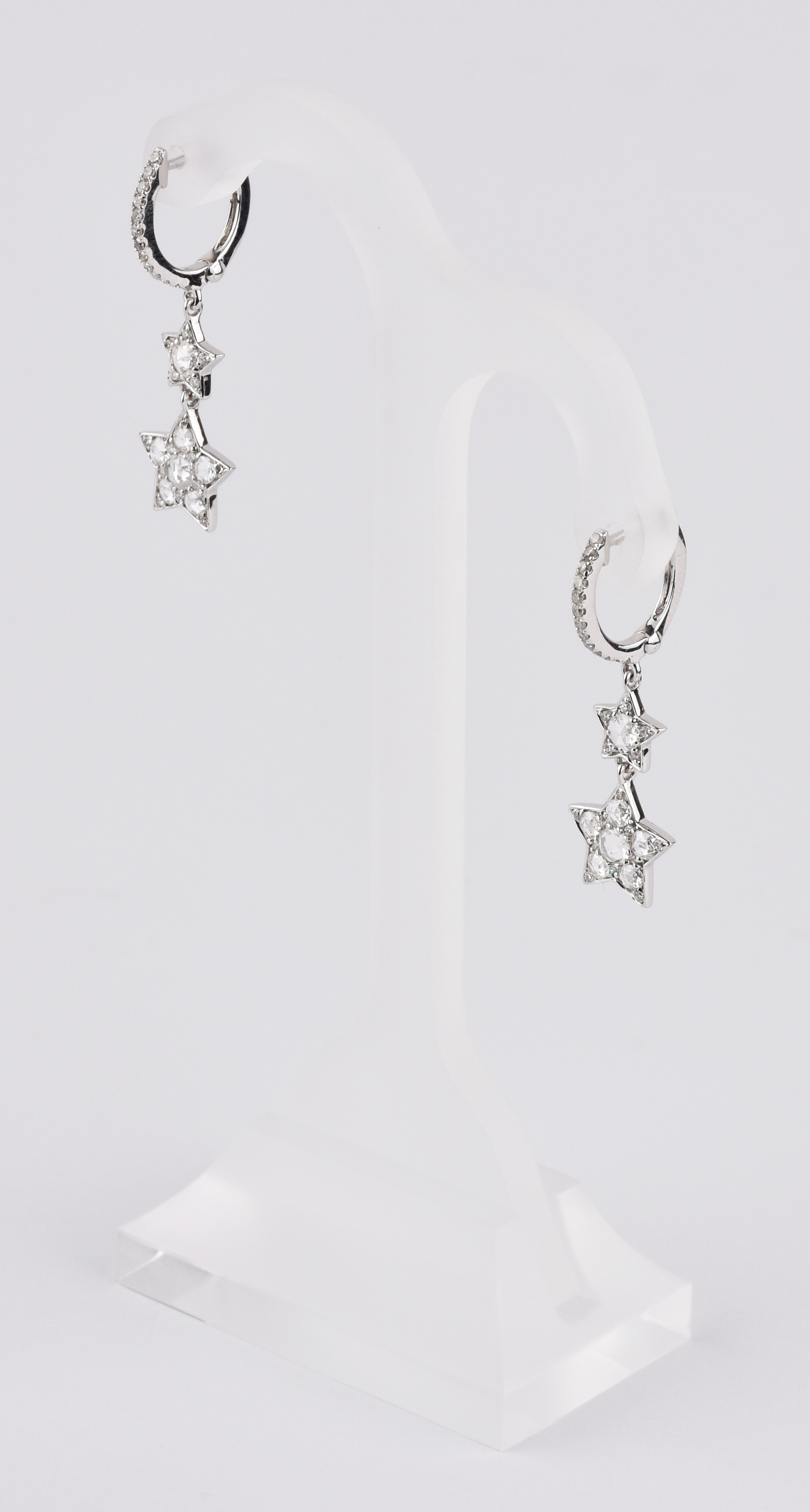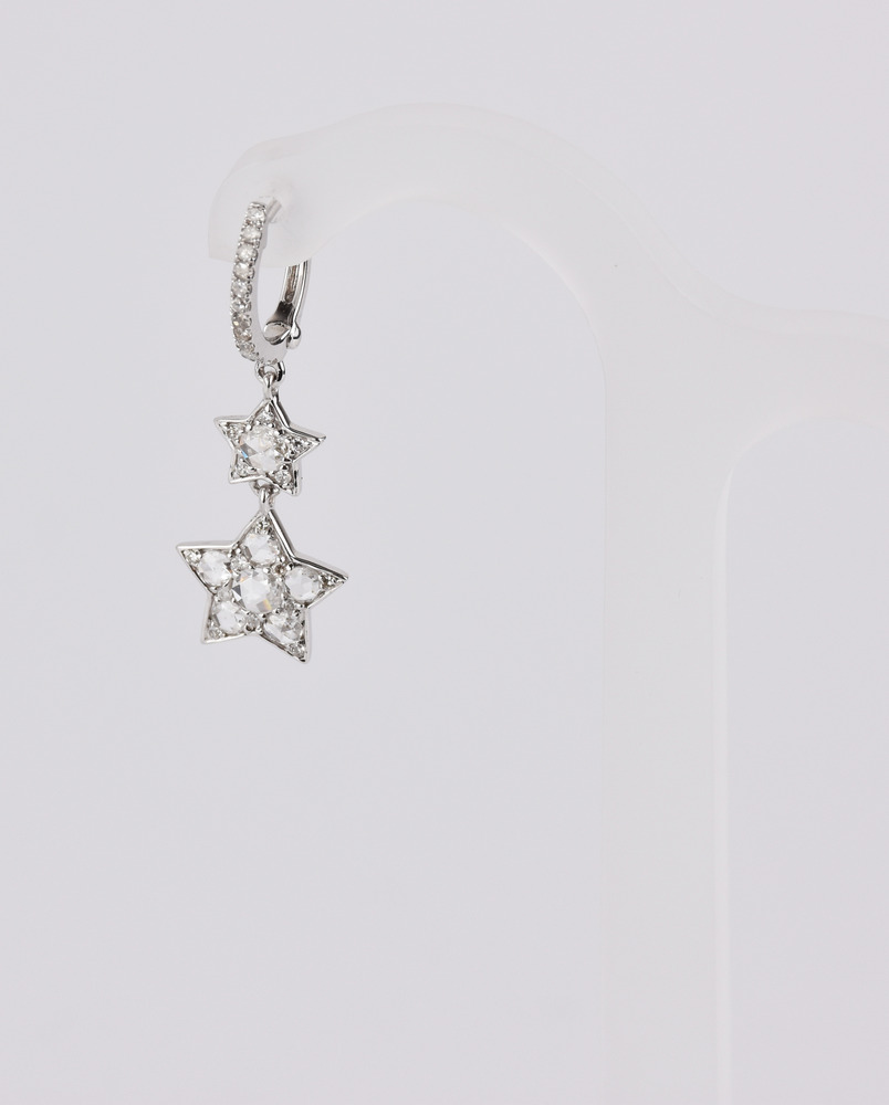 PAIO DI ORECCHINI PENDENTI IN ORO A BASSO TITOLO E DIAMANTI monachella in oro 14 kt e brillanti con due stelle pendenti decorate in diamanti taglio rosa per ct 0.85 circa, punzone 585, g 2,5 lungh. cm 3 Stato di conservazione complessivo ottimo. Peso delle pietre stimato per quanto permette la montatura. PAIR OF PENDANT EARRINGS IN DIAMONDS AND 14K GOLD Overall excellent condition. Estimated stones weight as gauged within the limitations of the mount.