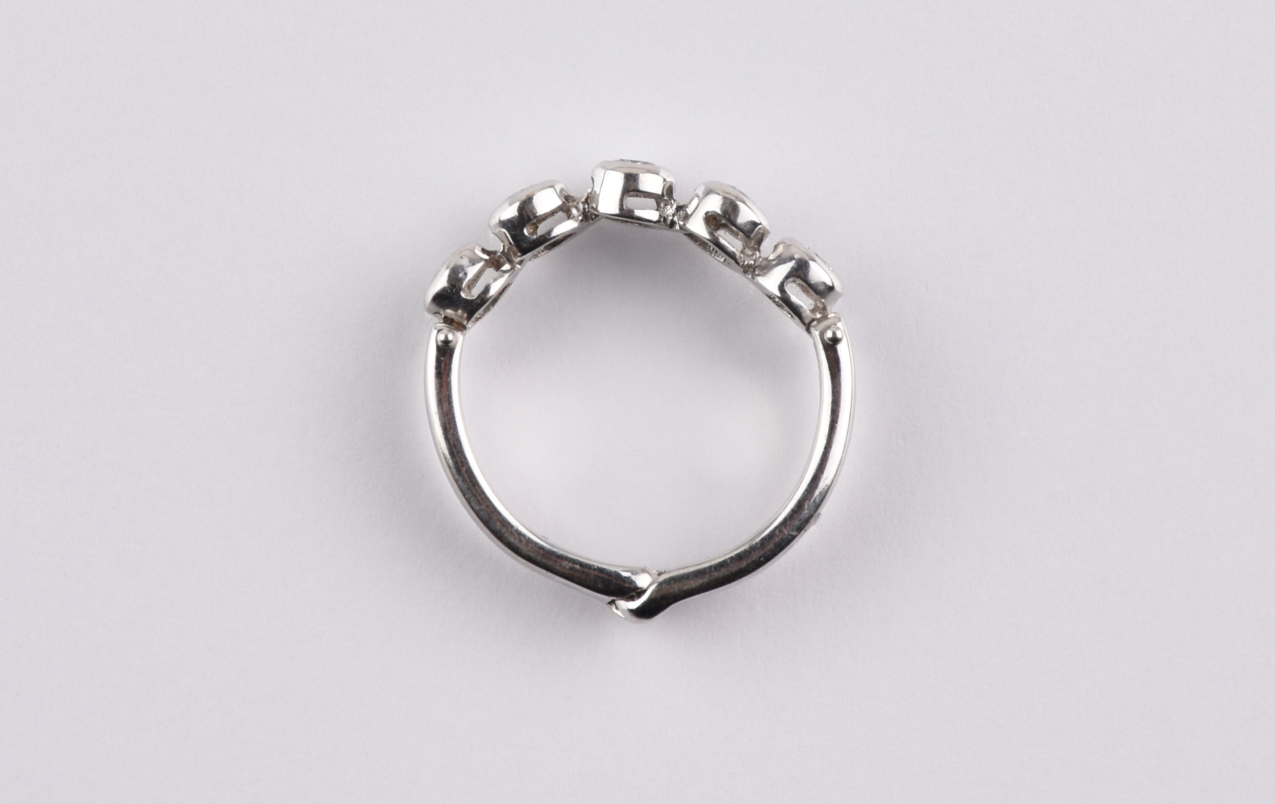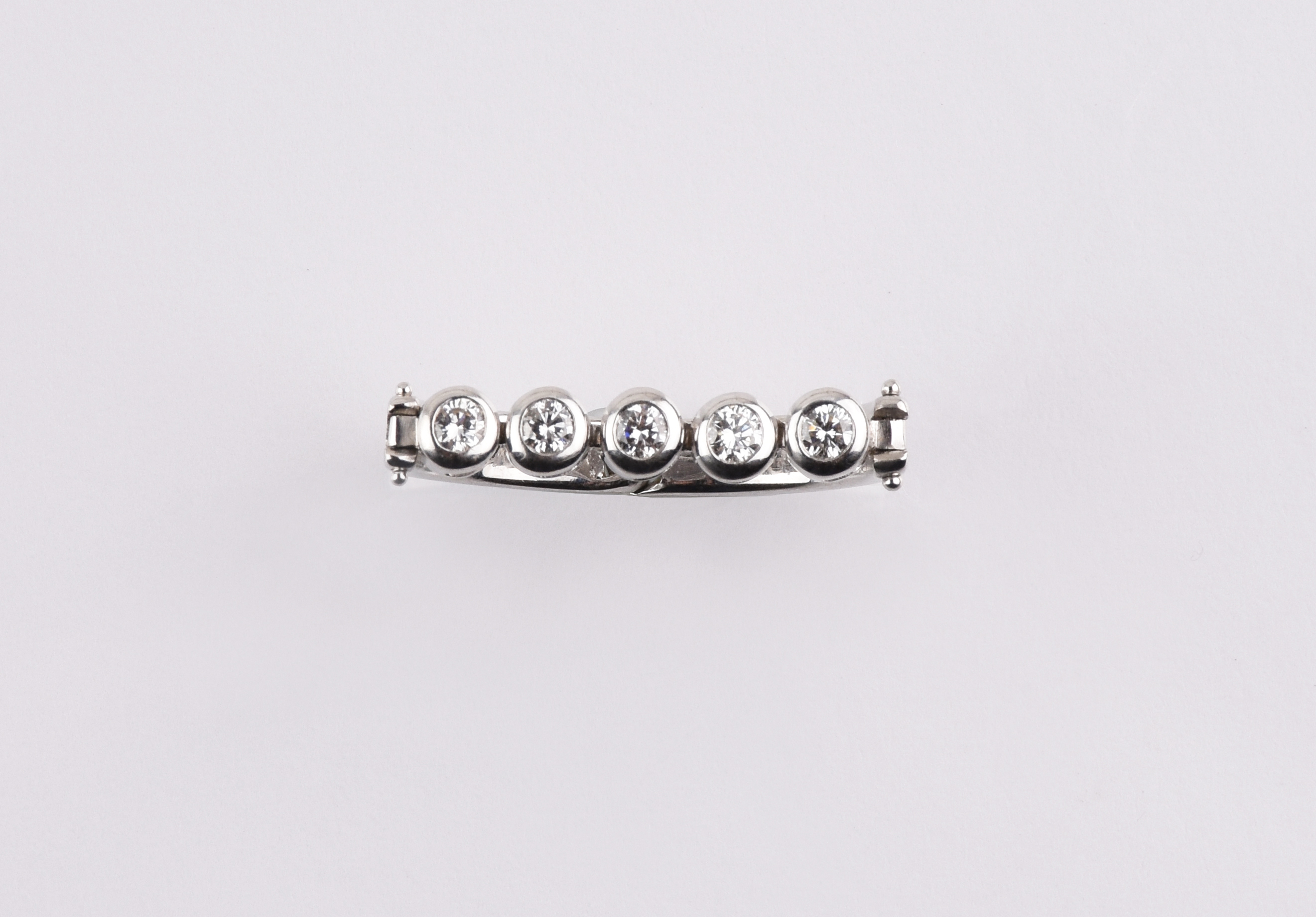 ANELLO IN ORO BIANCO E DIAMANTI ad una linea di cinque diamanti per ct 0.40 circa entro montatura flessibile a castoni, punzone 750, g 4,6 mis. 13 Stato di conservazione complessivo ottimo. Peso delle pietre stimato per quanto permette la montatura. FLEXIBLE RING IN WHITE GOLD AND DIAMONDS Overall excellent condition. Estimated stones weight as gauged within the limitations of the mount.