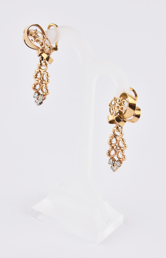 PAIO DI ORECCHINI PENDENTI IN ORO ROSA E DIAMANTI realizzati con motivo a fiocco e pendente a volute traforate decorato in diamanti per ct 0.50 circa, punzone 18K, g 9,7 lungh. cm 4 Stato di conservazione complessivo ottimo. Peso delle pietre stimato per quanto permette la montatura. PAIR OF PENDANT EARRINGS IN ROSE GOLD AND DIAMONDS Overall excellent condition. Estimated stones weight as gauged within the limitations of the mount.