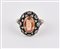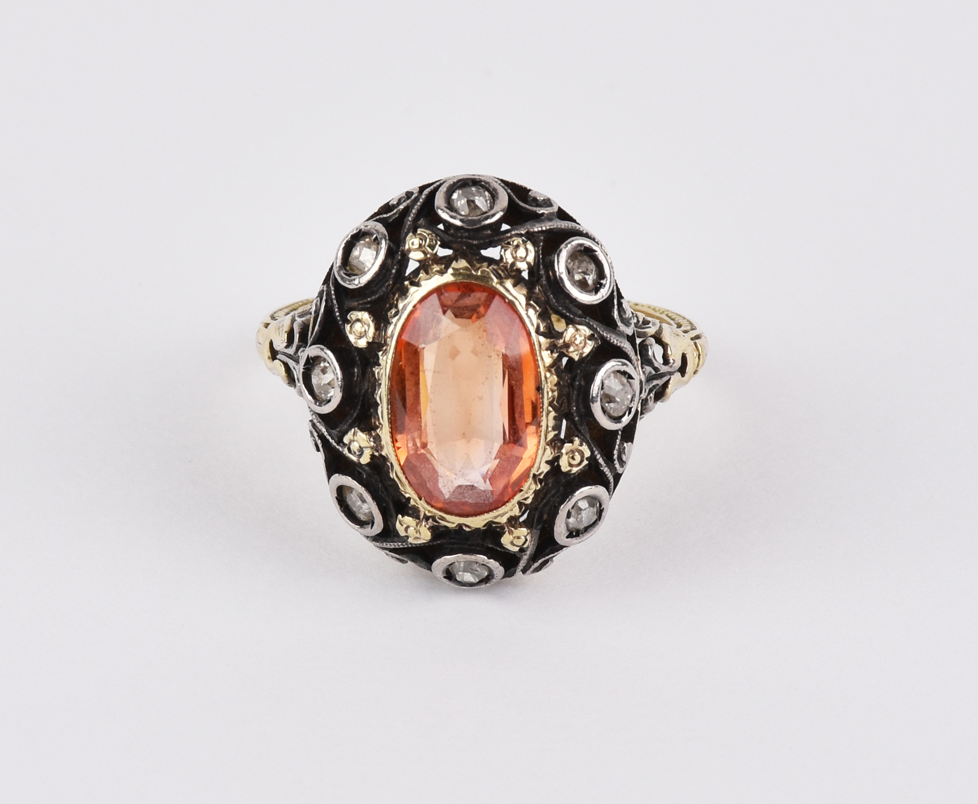 ANELLO IN ARGENTO, ORO GIALLO, DIAMANTI E PASTA VITREA al centro elemento bombato traforato a volute decorato in diamanti taglio rosa e pasta vitrea arancione, gambo cesellato a motivi fogliacei, g 3,9 mis. 11 Stato di conservazione complessivo ottimo. GLASS PASTE, DIAMONDS, SILVER AND YELLOW GOLD RING Overall excellent condition.