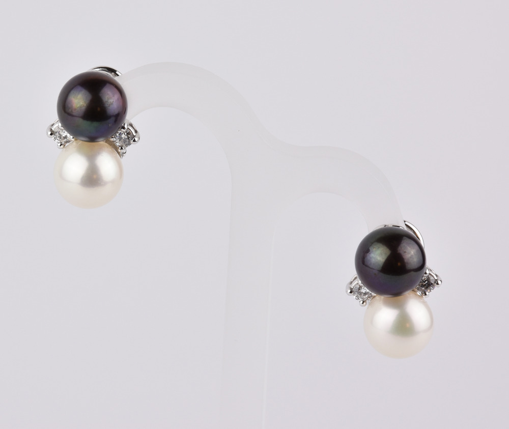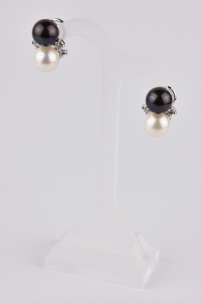 PAIO DI ORECCHINI IN ORO BIANCO, PERLE E DIAMANTI ciascuno composto di una perla grigia ed una bianca diam. mm 9,9 circa entro montatura decorata da due diamanti per complessivi ct 0.35 circa, punzone 750, g 11, lungh. cm 2 Stato di conservazione complessivo ottimo. Peso delle pietre stimato per quanto permette la montatura. PAIR OF EARRINGS IN WHITE GOLD, BLACK AND WHITE PEARLS AND DIAMONDS Overall excellent condition. Estimated stones weight as gauged within the limitations of the mount.