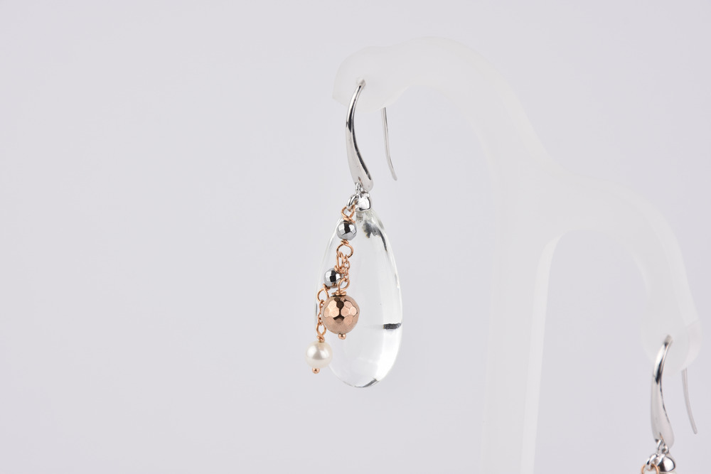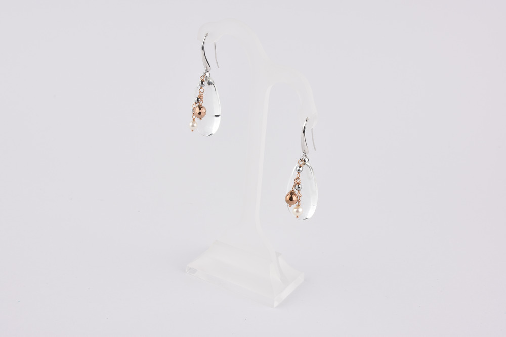 PAIO DI ORECCHINI PENDENTI IN ORO BIANCO E ROSA, ARGENTO, CRISTALLO DI ROCCA...