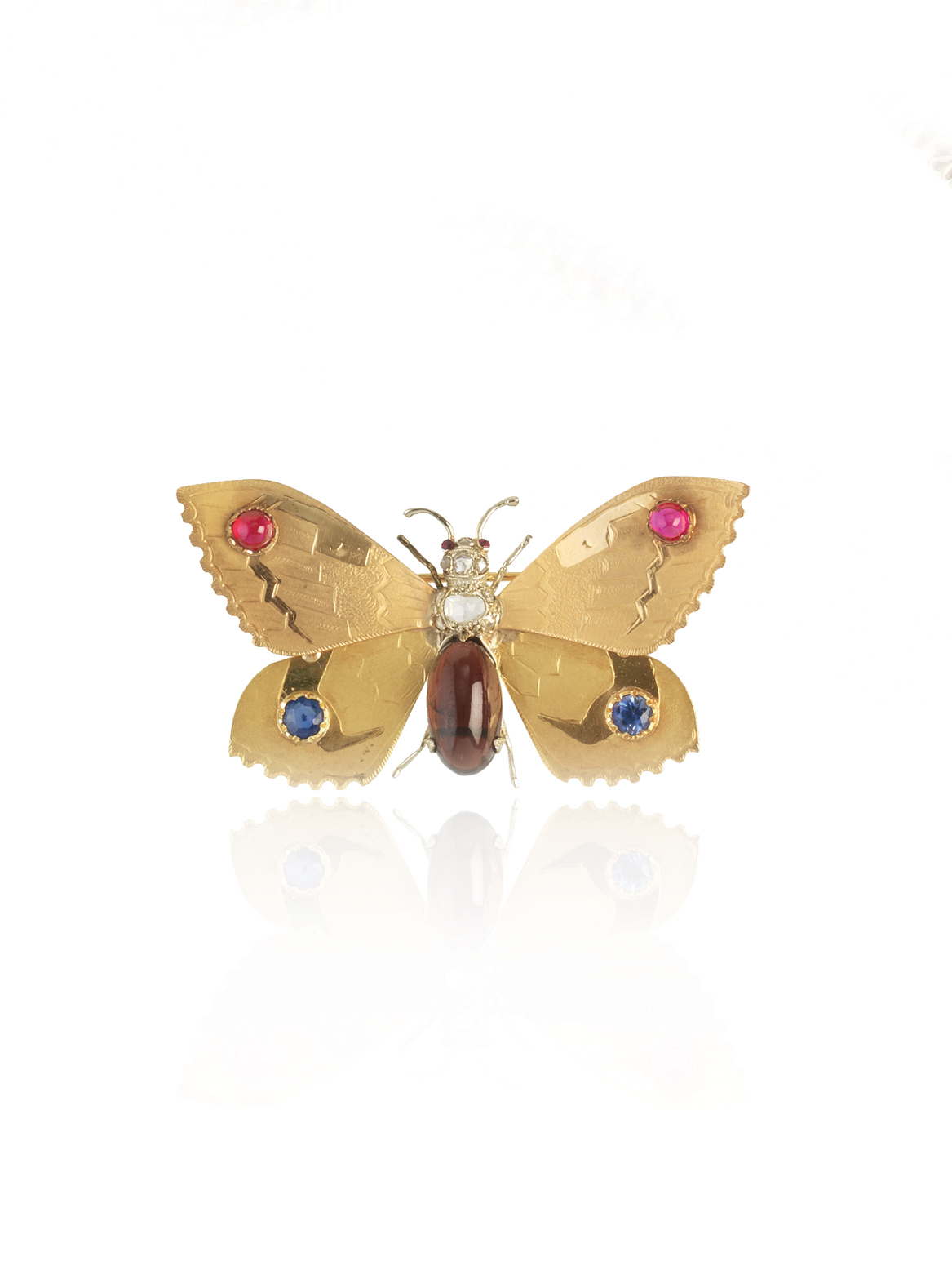 SPILLA IN ORO DEI TRE COLORI, GRANATO, DIAMANTI E PASTE VITREE modellata a farfalla in oro rosa e giallo cesellato e satinato decorato paste vitree rosse e blu, corpo in oro bianco, granato cabochon e diamanti taglio rosa, g 17,5 dim. cm 6,2x3,3 Stato di conservazione complessivo ottimo. GARNET, DIAMONDS, GLASS PASTE, YELLOW, ROSE AND WHITE GOLD BUTTERFLY BROOCH Overall excellent condition.