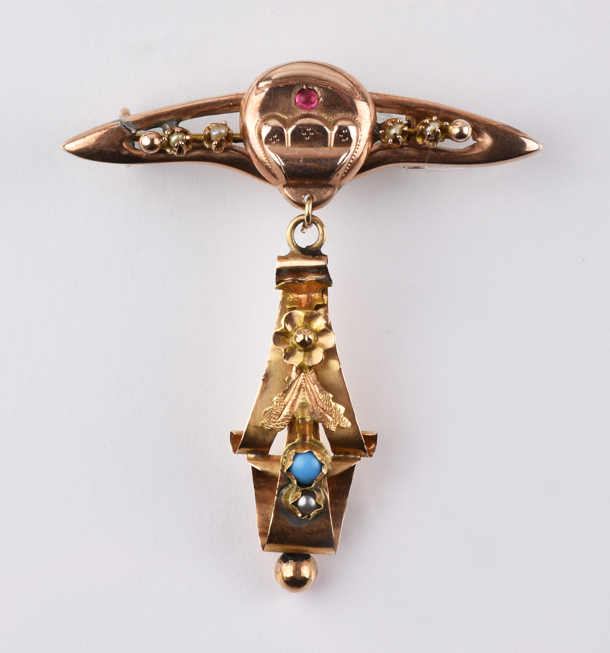 BRACCIALE RIGIDO E SPILLA IN ORO A BASSO TITOLO MICROPERLE E PASTE il bracciale a doppia canna vuota in oro rosa 8 kt cesellato decorato al centro da trifoglio e motivo a volute in microperle, punzone 333, diam. cm 6; spilla a barretta in oro rosa 8 kt, con pendente borbonico in oro giallo 18 kt decorati in microperle, pasta vitrea rossa e pasta di turchese, dim. cm 4,5x4,5 complessivi g 18 Stato di conservazione complessivo molto buono. La parte superiore della spilla presenta una saldatura aperta, spilla e pendente sono coevi ma assemblati. A 9KT CANE ROSE GOLD BANGLE BRACELET AND A BROOCH IN 9 AND 18 KT GOLD, MICROPEARLS, GLASS AND TURQUOISE PASTE Overall very good condition. The upper part of the brooch presents a broken solder, brooch and pendant are from the same period but were assembled.