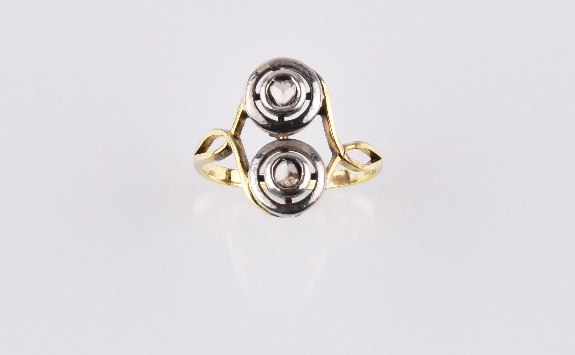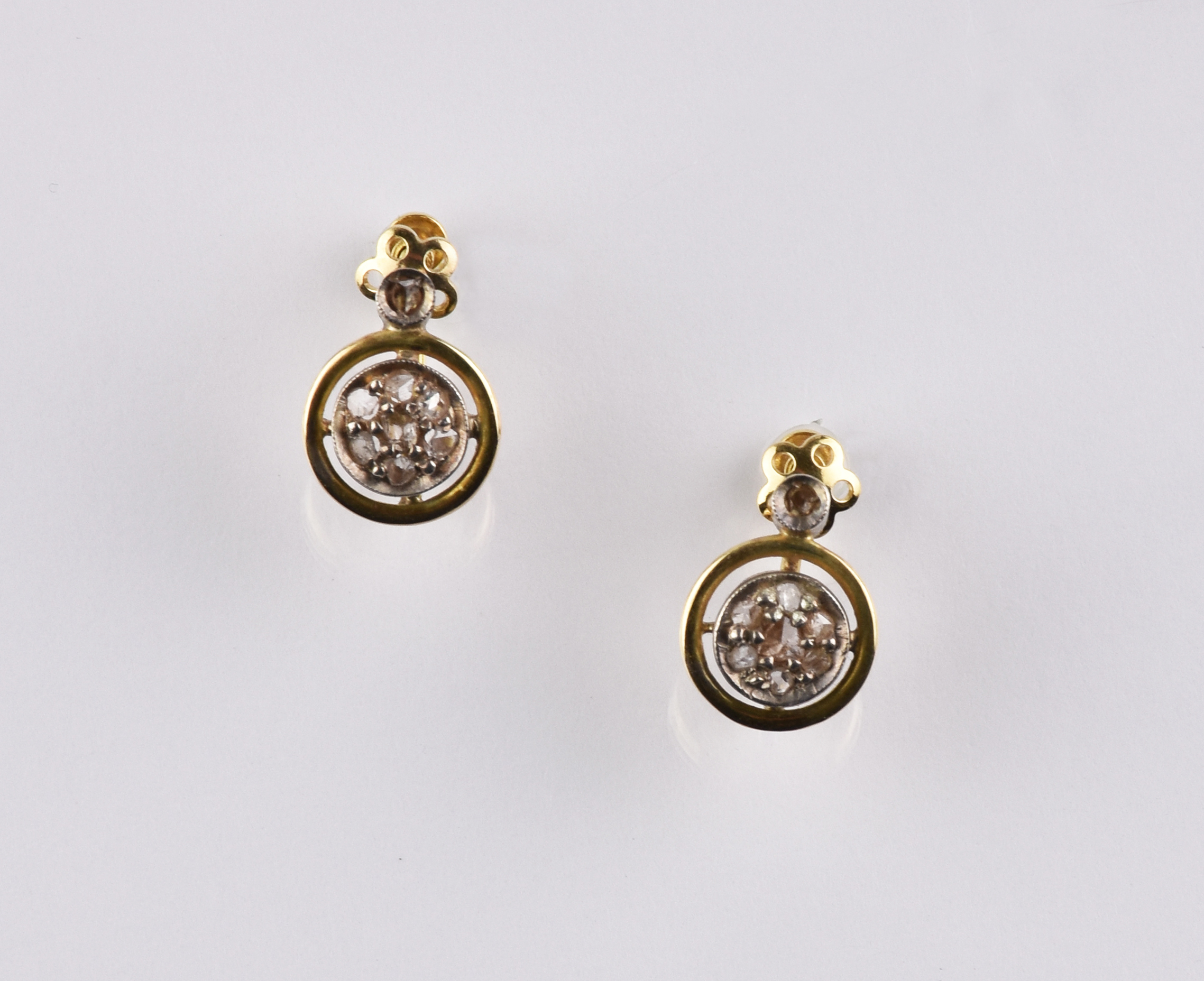 DEMI PARURE COMPOSTA DI ANELLO E PAIO DI ORECCHINI IN ORO GIALLO, ARGENTO E DIAMANTI l’anello in oro giallo decorato al centro da piccoli diamanti taglio rosa entro castone traforato in argento, mis. 12; paio di orecchini analogamente decorati, diam. cm 1, complessivi g 5,2 Stato di conservazione complessivo ottimo. A RING AND A PAIR OF EARRINGS EN SUITE IN YELLOW GOLD, SILVER AND DIAMONDS Overall excellent condition.