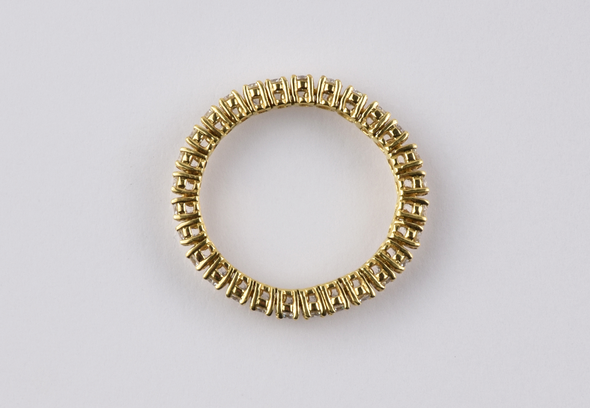 ETERNITY IN ORO GIALLO E DIAMANTI ad una linea di diamanti taglio brillante rotondo per ct 0.70 circa entro montatura flessibile, g 2,6 mis. 14 Stato di conservazione complessivo ottimo. Peso delle pietre stimato per quanto permette la montatura. DIAMONDS AND YELLOW GOLD ETERNITY Overall excellent condition. Estimated stones weight as gauged within the limitations of the mount.