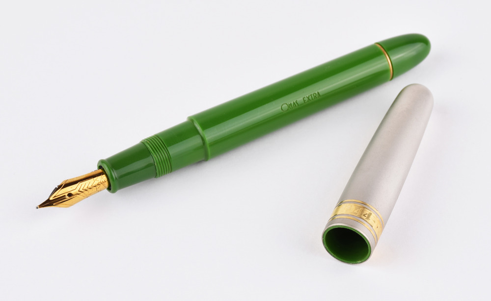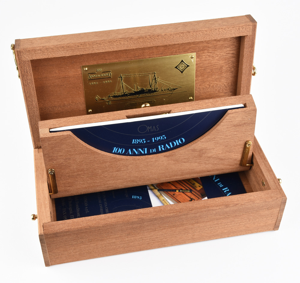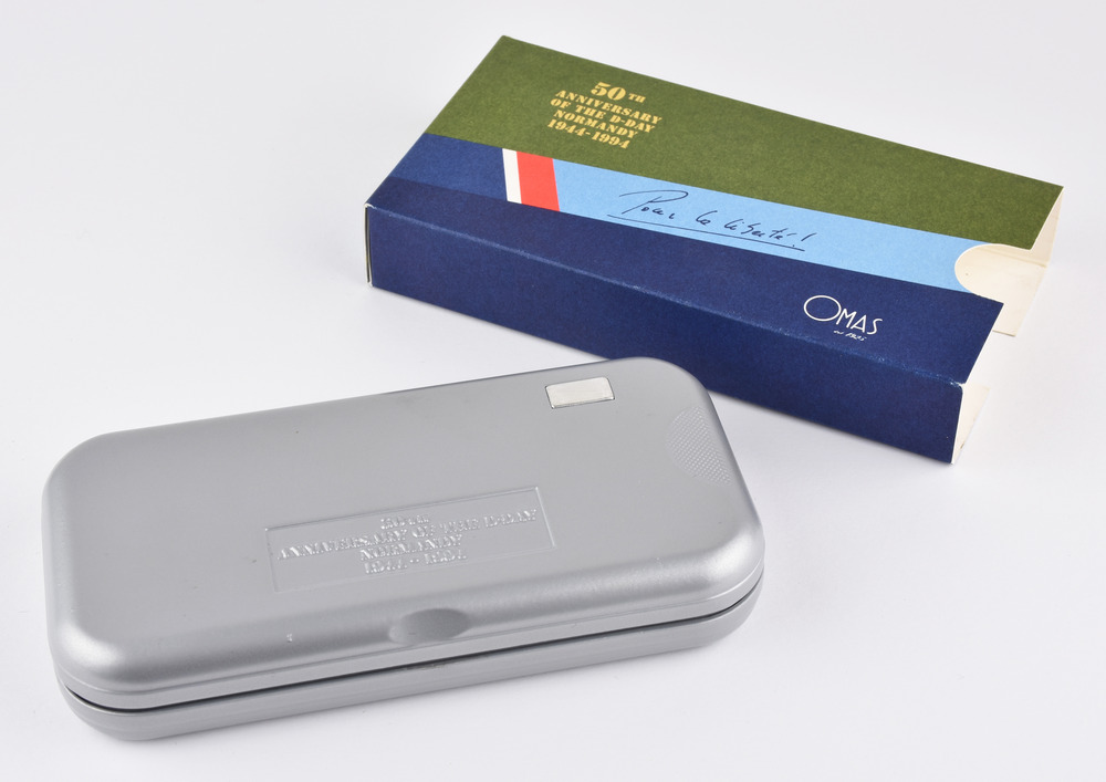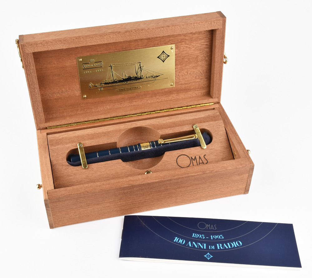 DUE PENNE STILOGRAFICHE, OMAS, EDIZIONI LIMITATE D-DAY E 100 ANNI DI RADIO rispettivamente con corpo a sezione ogivale in resina vegetale verde, cappuccio placcato in alluminio anodizzato, clip e decoro in metallo placcato oro, pennino in oro, n. 3217/5300, punzone 750 con scatola, controscatola e libretto; corpo a sezione tonda in resina vegetale blu con inserti in argento, clip e decoro in metallo placcato oro, pennino in oro, n. 0194/4000, punzone 750 con scatola, controscatola e libretto Stato di conservazione complessivo ottimo. TWO OMAS LIMITED EDITIONS FOUNTAIN PENS D-DAY AND 100 ANNI DI RADIO IN VEGETAL RESIN AND GOLD both equipped with outer box, display box and booklet Overall excellent condition.