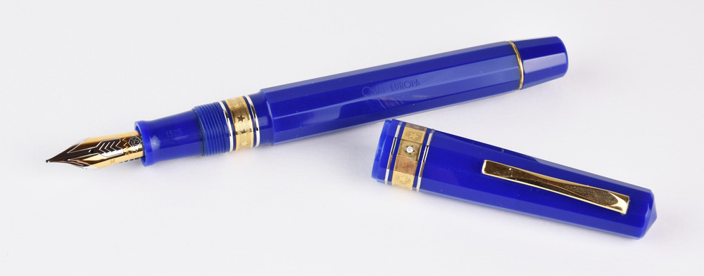 DUE PENNE STILOGRAFICHE, OMAS, EDIZIONI LIMITATE EUROPA E ROMA 2000 rispettivamente con corpo a sezione dodecagonale in resina vegetale blu, clip e decoro in metallo placcato oro con piccolo diamante, pennino in oro, n. 1525/5300, punzone 750, con scatola, controscatola e libretto; corpo a sezione tonda in resina vegetale blu, clip e decoro in metallo placcato oro, pennino in oro, punzone 18k, con scatola, controscatola e libretto Stato di conservazione complessivo ottimo. TWO OMAS LIMITED EDITIONS FOUNTAIN PENS EUROPA AND ROMA 2000 IN VEGETAL RESIN AND GOLD both equipped with outer box, display box and booklet Overall excellent condition.