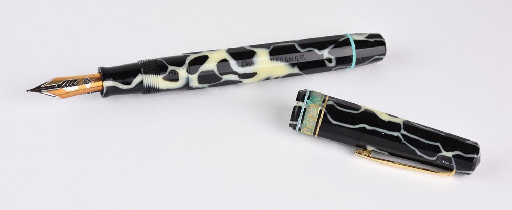 PENNA STILOGRAFICA, OMAS, EDIZIONE LIMITATA GALILEO GALILEI corpo a sezione dodecagonale in celluloide “Wild Pattern” nero e crema, clip e decoro in metallo placcato oro, pennino in oro, n. 0364/4692, punzone 750 con scatola, controscatola e libretto Stato di conservazione complessivo molto buono. I decori esterni presentano ossidazione. OMAS LIMITED EDITION FOUNTAIN PEN GALILEO GALILEI IN WILD PATTERN CELLULOID AND GOLD equipped with outer box, display box and booklet Overall very good condition. The external decorations present oxidation.