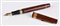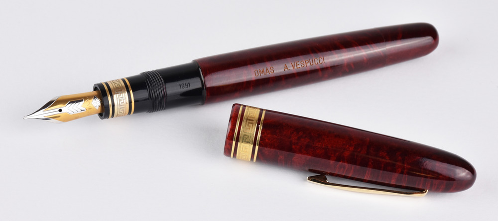 DUE PENNE STILOGRAFICHE, OMAS, EDIZIONI LIMITATE CRISTOFORO COLOMBO II E AMERIGO VESPUCCI rispettivamente con corpo a sezione dodecagonale in radica, clip e decoro in metallo placcato oro, pennino in oro, punzoni 1992 e 750 con scatola, controscatola e libretto; corpo a sezione tonda in radica, clip e decoro in metallo placcato oro, pennino in oro 14k, punzoni 199 e 585 con scatola, controscatola, libretto e confezione esterna in tessuto usato per le vele Stato di conservazione complessivo ottimo. TWO LIMITED EDITION FOUNTAIN PENS, OMAS, CRISTOFORO COLOMBO II AND AMERIGO VESPUCCI IN BRIARWOOD AND GOLD both equipped with outer box, display box and booklet Overall excellent condition.