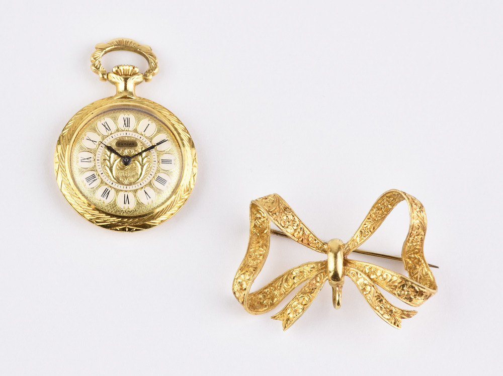 OROLOGIO DA TASCHINO, SARCAR, IN ORO 18 K, CORREDATO DI SPILLA IN ORO GIALLO 18 K Cassa interamente incisa a motivi fogliacei, floreali e volute. Quadrante guilloché oro con riserva centrale con volute a rilievo, anello dei minuti e ore in numeri romane entro riserve sagomate in smalto bianco. Movimento a carica manuale con scappamento a cilindro. Diam. mm 24,5 Corredato di spilla in oro cesellato a volute modellata a fiocco a cui l’orologio può essere sospeso, larghezza mm 30, g 6,3 Stato di conservazione complessivamente molto buono. Cassa e quadrante in condizioni ottime. Movimento funzionante, una revisione è consigliata. Spilla in condizioni ottime. AN 18 K GOLD POCKET WATCH, SARCAR, WITH AN 18 K BOW PIN The watch is in overall very good condition. The movement is running and in good order, a service is recommended, given the age of the watch. Bow pin in very good condition.