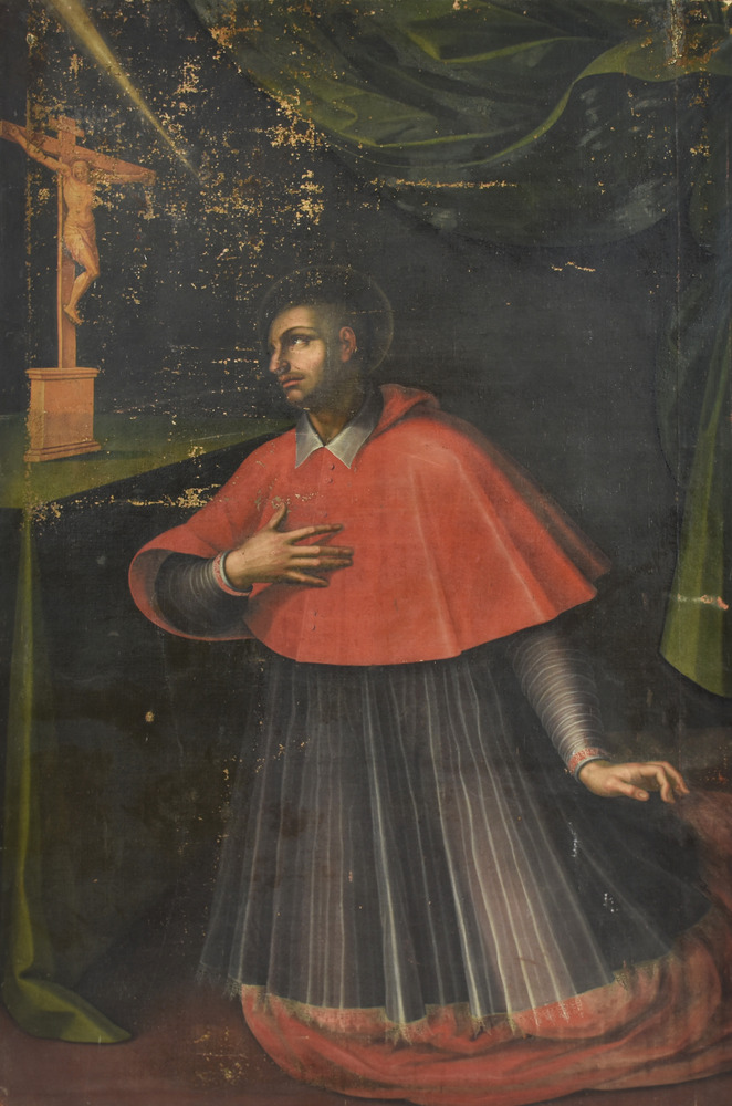 Anonimo secolo XVIII San Carlo Borromeo olio su tela (rintelo), cm 195x125 Lombardia fine XVIII secolo Difetti, restauri e piccole cadute Saint Charles Borromeo Oil on canvas Lombardy, end of XVIII Century