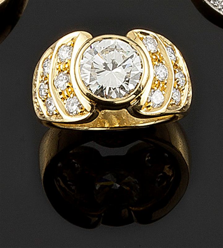 Anello in oro giallo, a fascia, con diamante taglio brillante centrale di ct 3,11 ca ed ai lati