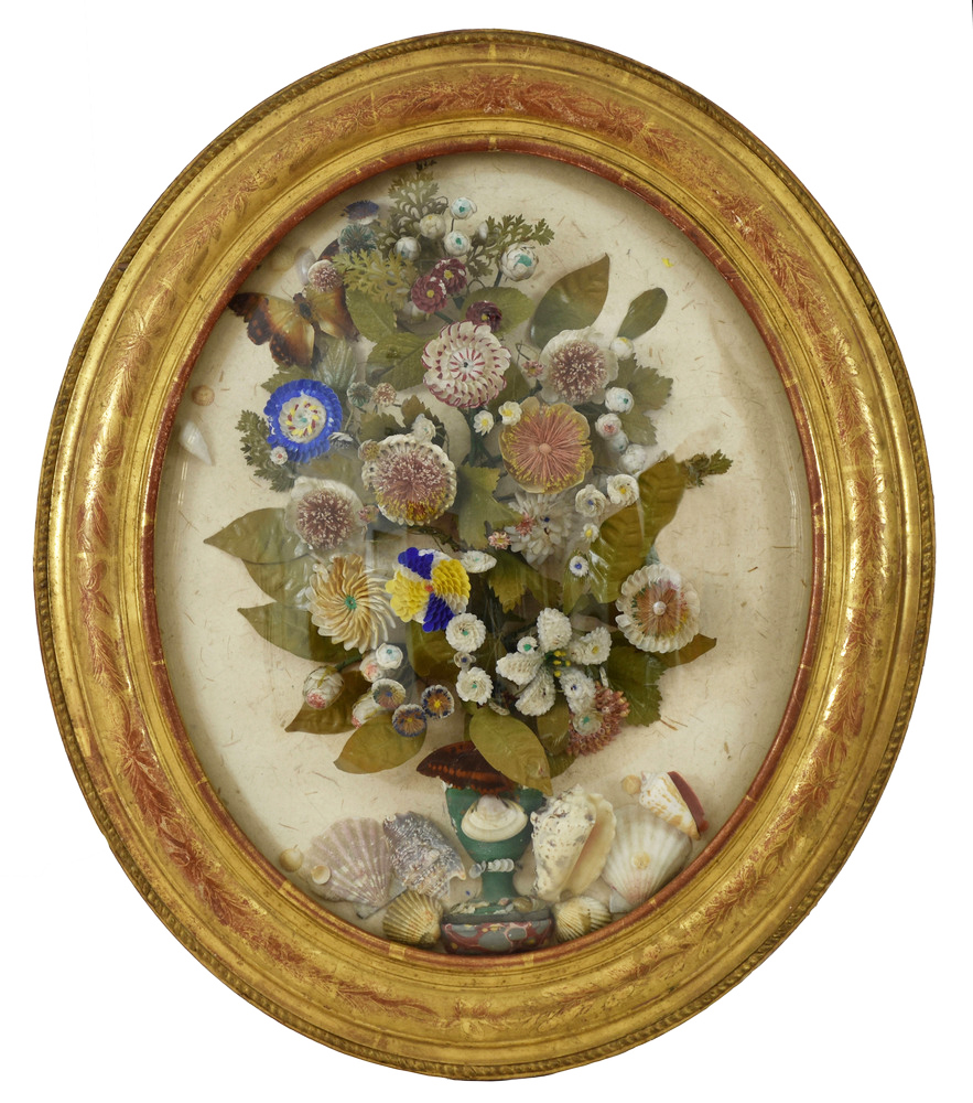 Composizione ovale natura morta con conchiglie cm 60x49 Francia, epoca Napoleone III A French Napoleon III dried flowers, butterflies an seashells ensemble
