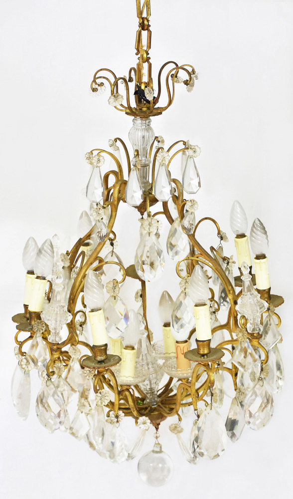 Lampadario Maria Teresa a 12 luci in bronzo dorato con gocce in cristallo...