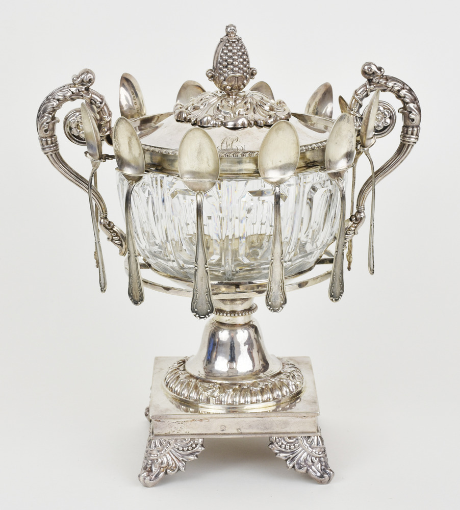 Compostiera in argento e cristallo completa di 12 cucchiaini in argento non pertinenti altezza cm 24 Francia, XIX secolo A XIX Century French silver and crystal cup