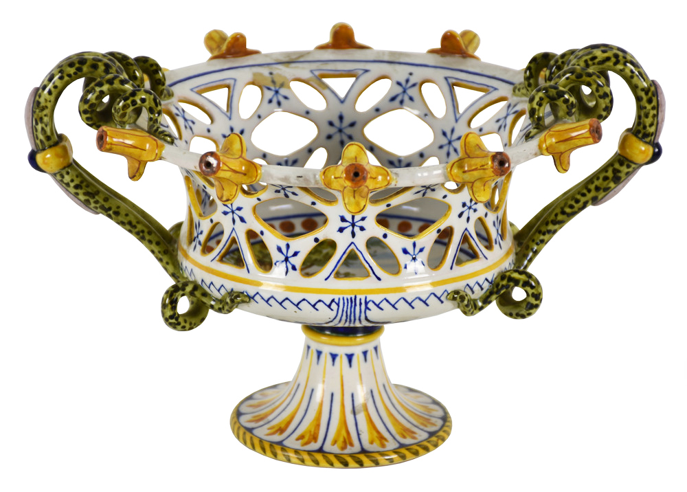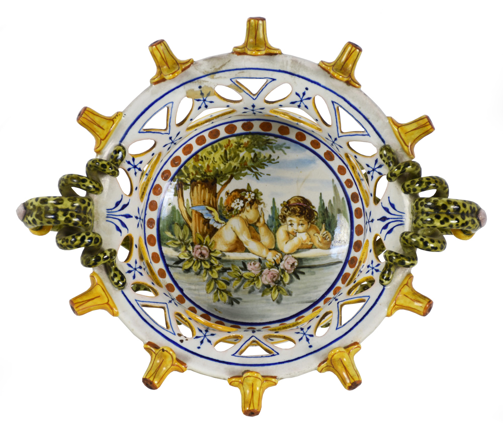Alzata centrotavola manifattura Ginori, fine secolo XIX in ceramica policroma, anse a serpenti, vasca traforata dipinta con due puttini alati, altezza cm 16 Lievi danni