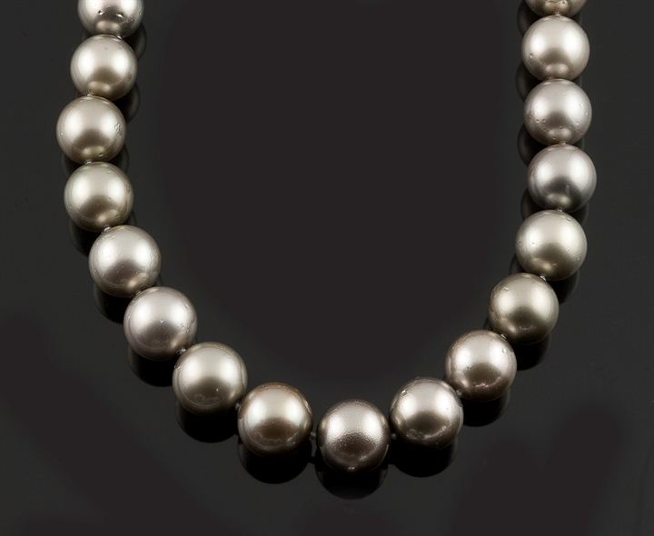 Collana composta da trentuno perle Tahiti dal diam di mm 12,8 a 15; chiusura sferica in oro bianco