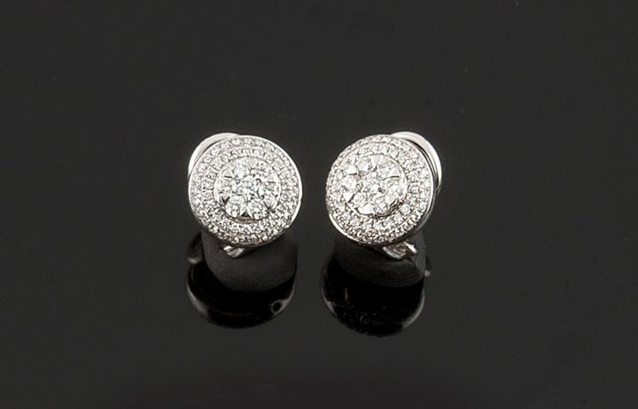 Coppia di orecchini in oro bianco, di forma rotonda, con diamanti taglio brillante per complessivi ct 2,20 ct