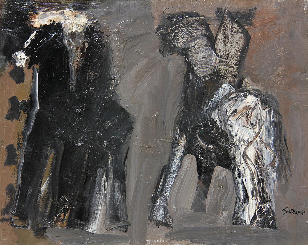 Mario SIRONI (Tempio Pausania 1885-05-12 Milano 1961-08-13) Cavalieri 1955 olio su tela cm. 40 x 50Firma "Sironi" (in basso a destra) Timbro della galleria Farsetti, Prato (al retro) Firma "Sironi" (in basso a destra) Timbro della galleria Farsetti, Prato (al retro) Lettera dell'Associazione per il patrocinio e la promozione della figura e dell'opera di Mario Sironi, con arch. n. 227/17 RA