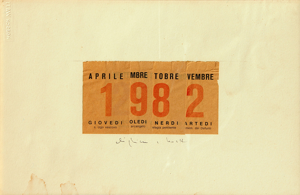 Alighiero BOETTI (Torino 1940-12-16 Roma 1994-04-24) Calendario 1982 collage e tecnica mista su cartoncino cm. 25 x 38Firma "Alighiero Boetti" (al centro) Firma "Alighiero Boetti" (al centro) Autentica dell'Archivio Alighiero Boetti con n°7257 del 27/05/2013