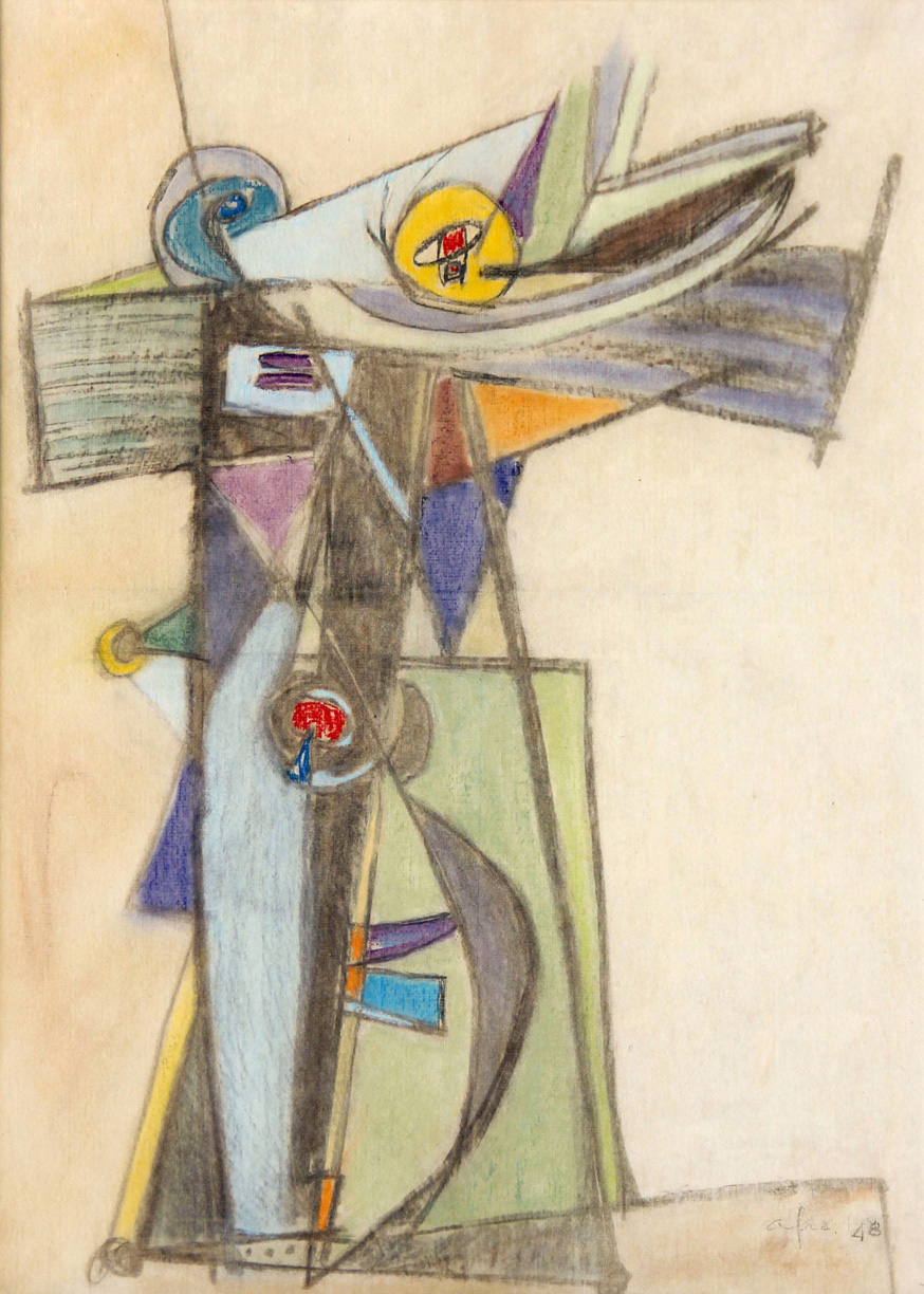 Basaldella AFRO (Udine 1912-03-04 Zurigo 1976-07-24) Senza titolo 1948 pastelli su carta intelata cm. 65 x 50Firma, data "Afro 48" (in basso a destra) Timbro dell'Archivio Afro, Roma (al retro) Firma, data "Afro 48" (in basso a destra) Timbro dell'Archivio Afro, Roma (al retro) Autentica dell'Archivio Afro Basaldella su fotografia