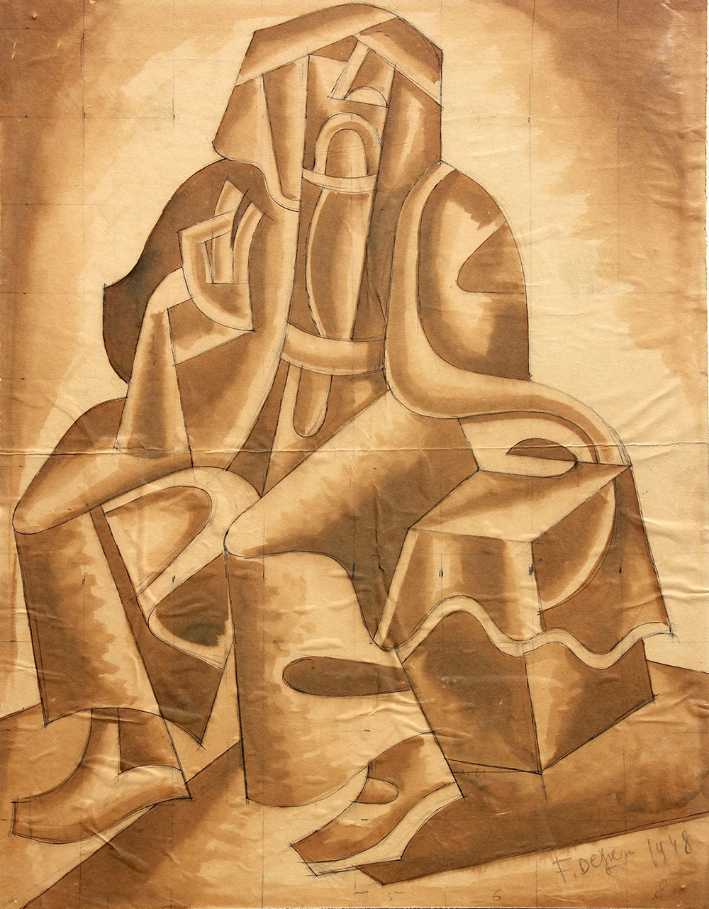 Fortunato DEPERO (Fondo 1892-04-01 Rovereto 1960-11-29) Monaco del deserto 1948 matita e china su carta cm. 71.8 x 54.2Studio per l'omonimo dipinto Firma, data "F. Depero, 1948" (in basso a destra) Studio per l'omonimo dipinto Firma, data "F. Depero, 1948" (in basso a destra) Autentica dell'Archivio Unico per il Catalogo delle Opere Futuriste di Fortunato Depero, con n. FD-3459-DIS, con firma di Maurizio Scudiero