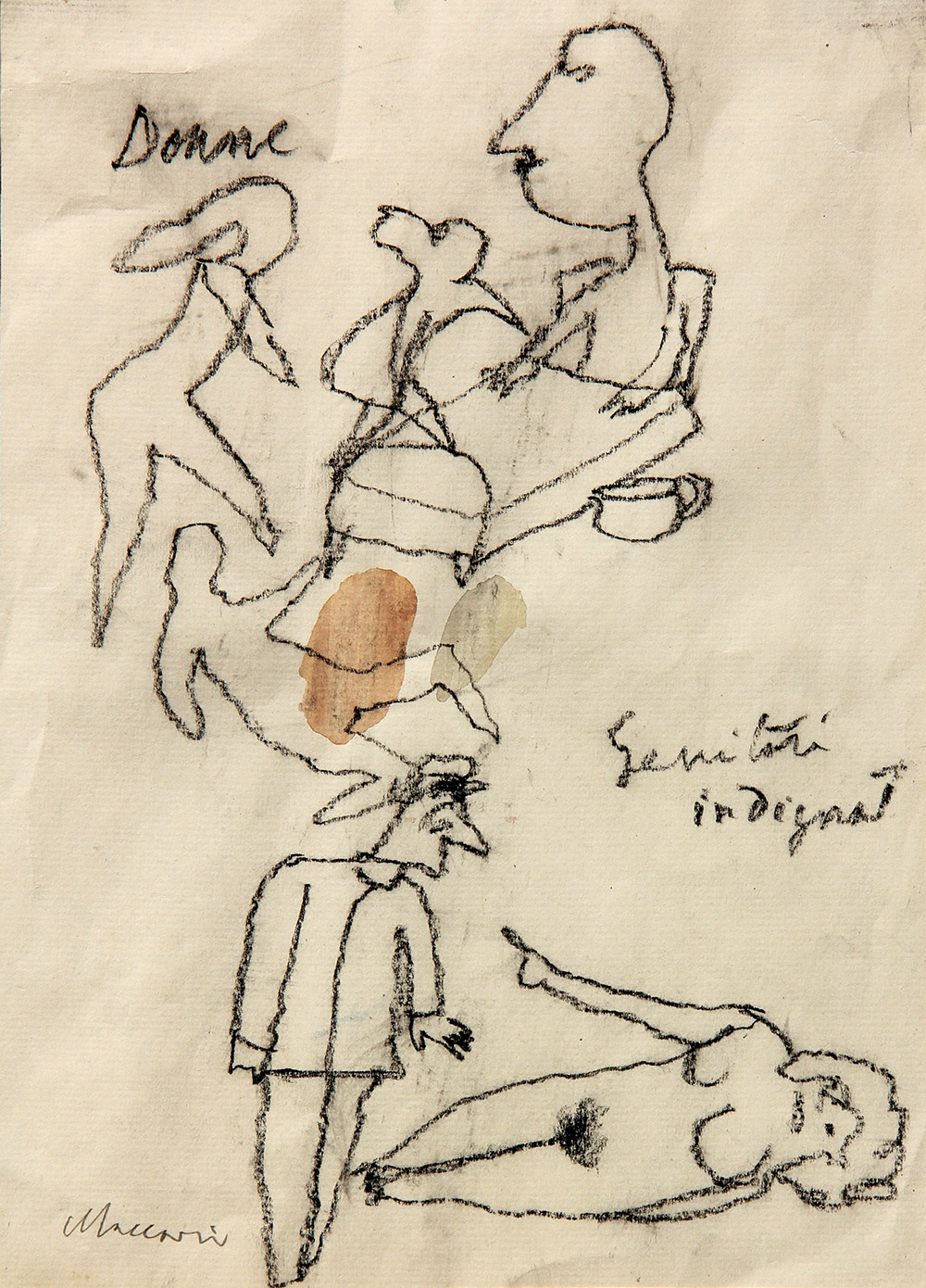Mino MACCARI (Siena 1898-11-24 Roma 1989-06-16) Genitori indignati tecnica mista su carta cm. 28 x 20Titolo "Genitori indignati" (al centro); firma "Maccari" (in basso a sinistra) Titolo "Genitori indignati" (al centro); firma "Maccari" (in basso a sinistra)