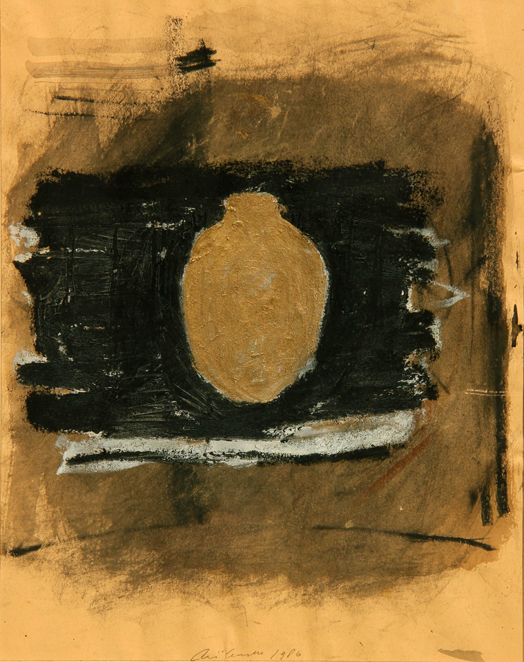 Piero PIZZI CANNELLA (Rocca di Papa 1955-11-20 ) Senza titolo 1986 tecnica mista con olio dorato su carta cm. 31.5 x 23.5Firma, data "Pizzi Cannella, 1986" (lin basso al centro) Firma, data "Pizzi Cannella, 1986" (lin basso al centro) Autentica dell'Archivio Pizzi Cannella su fotografia con n. 14/09