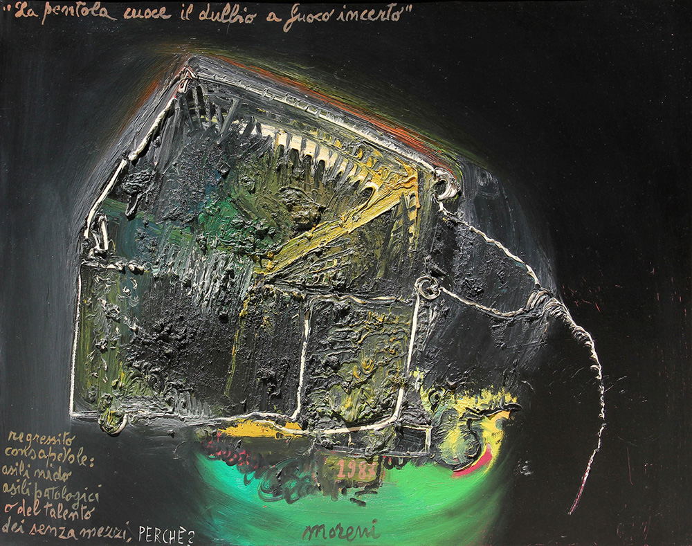 Mattia MORENI (Pavia 1920-11-12 Brisighella 1999-06-01) Regressivo consapevole. La pentola cuoce il dubbio a fuoco incerto 1987 olio su tela cm. 100 x 130"Mattia Moreni. Il regressivo consapevole", ed. Mondadori associati, Milano, p. 257 Titolo "La pentola cuoce il dubbio a fuoco incerto" (in alto a sinistra); data, firma "1987, Moreni" (in basso al centro) Titolo, misure, firma, data "Regressivo consapevole. La pentola cuoce il dubbio a fuoco incerto, cm. 100x130, Mattia Moreni, 1987"; etichetta e timbro della Galleria Annunciata, Milano (al retro) Titolo "La pentola cuoce il dubbio a fuoco incerto" (in alto a sinistra); data, firma "1987, Moreni" (in basso al centro) Titolo, misure, firma, data "Regressivo consapevole. La pentola cuoce il dubbio a fuoco incerto, cm. 100x130, Mattia Moreni, 1987"; etichetta e timbro della Galleria Annunciata, Milano (al retro)