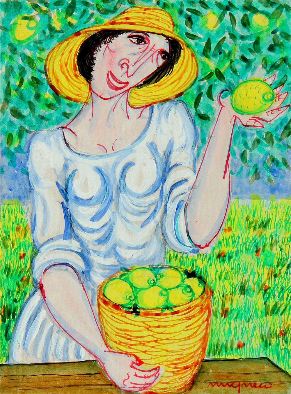 Giuseppe MIGNECO (Messina 1908-02-09 Milano 1997-02-28) Contadina con limoni 1988 acquarello e china su carta cm. 29 x 21N. C. Luciani "Migneco Catalogo generale Volume IV", BonapArte Editrice, Milano, 1986, p. 354, ill 1, rep. 3920Firma "Migneco" (in basso a destra) Timbro del Catalogo Generale Giuseppe Migneco (al retro) Firma "Migneco" (in basso a destra) Timbro del Catalogo Generale Giuseppe Migneco (al retro) Autentica dell'artista su fotografia con timbro del Catalogo Generale Giuseppe Migneco, con n. 3920