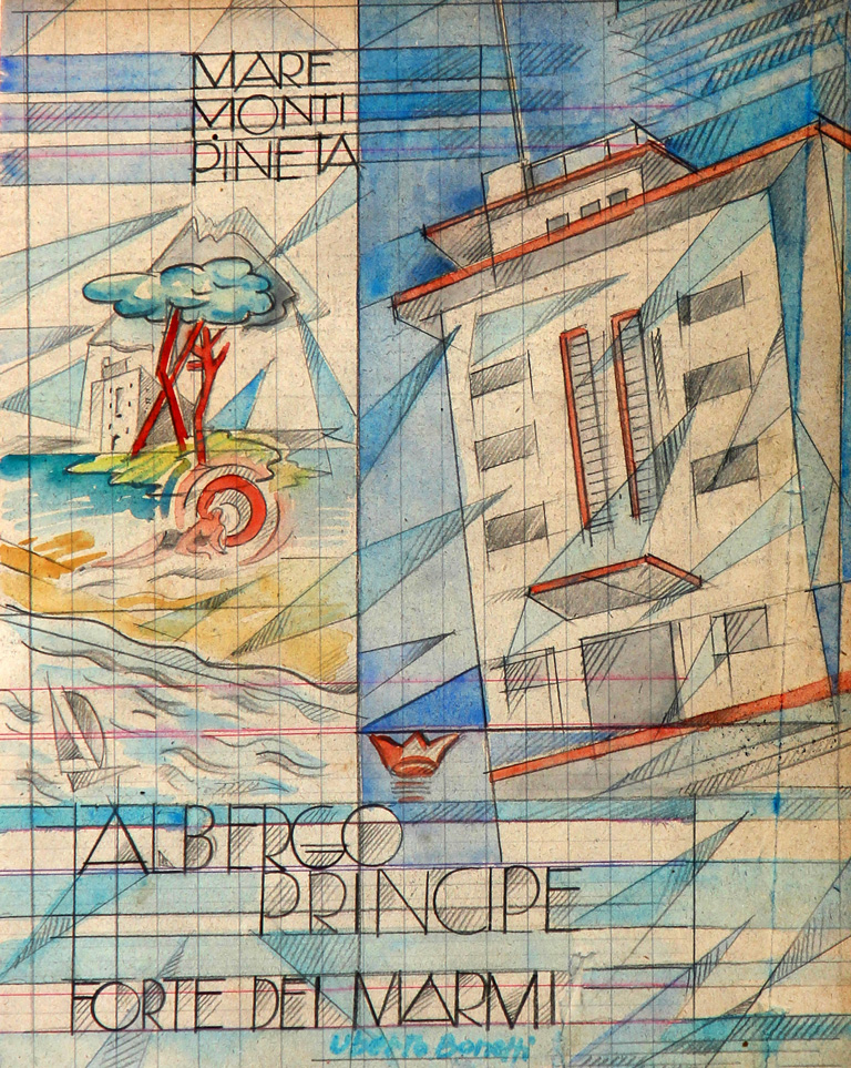 Uberto BONETTI (Viareggio 1909 - 1993 ) Bozzetto per Hotel Principe anni 30 (1930 - 1939) tecnica mista su carta cm. 23.5 x 18.5Firma "Uberto Bonetti" (in basso al centro) Firma "Uberto Bonetti" (in basso al centro) Autentica a cura delle figlie Adriana e Maria Elda Bonetti, con n. 838
