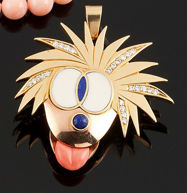 Ciondolo in oro giallo, firmato "Remida", a forma di personaggio buffo: occhi in avorio e lapislazzulo;