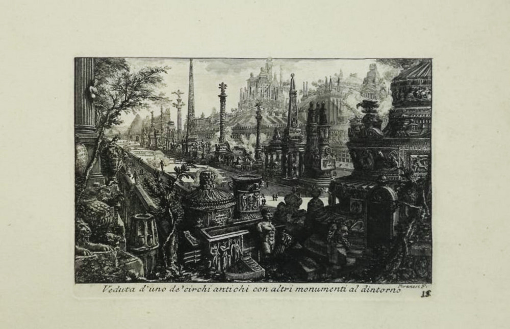 Veduta d’uno dé circhi antichi con altri monumenti al dintorno. Acquaforte. mm 132x187. Wilton Ely, 747