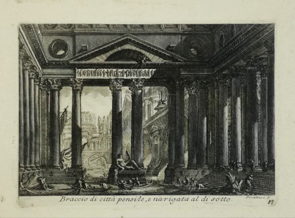 Braccio di città pensile e navigata al sotto. Acquaforte. mm 145x200. Focillon, 129