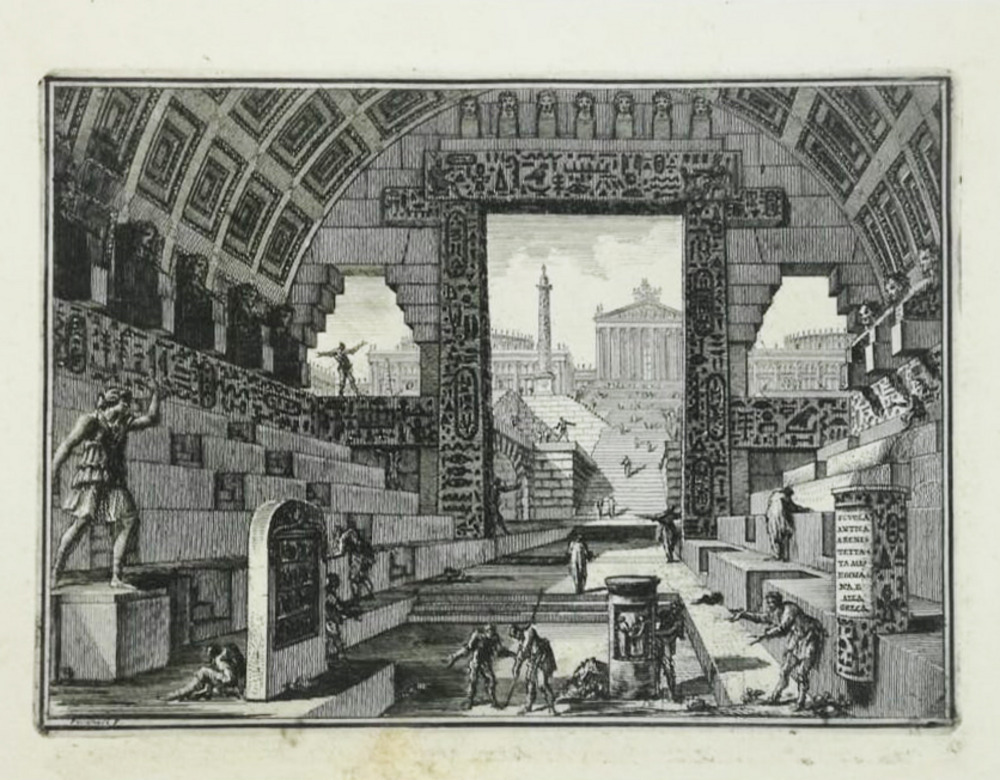 Scuola antica architettata alla egiziana e alla greca. Acquaforte. mm 153x216. Focillon, 128