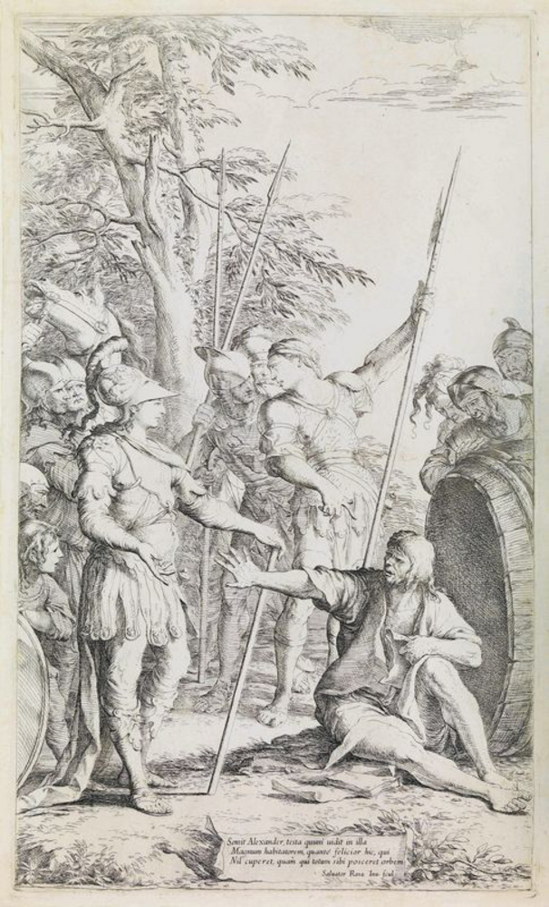 Rosa Salvator DIOGENE E ALESSANDRO. 1662 Acquaforte. mm 460x274. Wallace, 108. Bella impressione. Buoni margini oltre l’impronta della lastra.