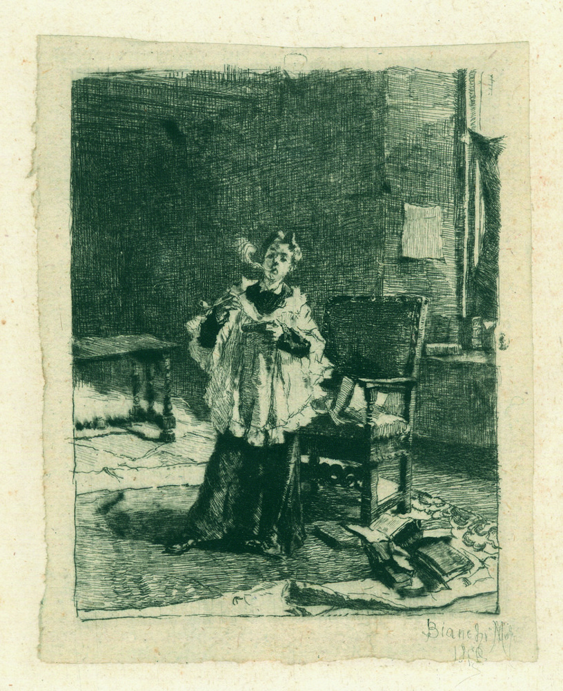 Mosè Bianchi UNA BOCCATA DI FUMO … 1873 Acquaforte e puntasecca. mm 185x135. Foglio: mm 305x252. Mezzetti, 76 Firmata e datata a puntasecca in basso a destra sulla lastra. Rara incisione da un dipinto in controparte intitolato “Una buona fumata”. Ottima impressione stampata con freschezza di barbe e brillante inchiostrazione su carta vergellata sottile applicata a cartoncino. Grandi margini, ottima conservazione.