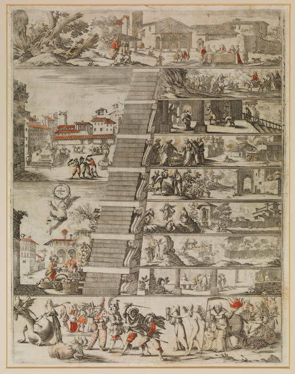 Valerio Spada LA QUARESIMA. 1653/54 Acquaforte. mm 490x375. Massar (Spada), 41. Giglioli, 233. Rara e singolare incisione; la lunga scalinata con i suoi quaranta gradini, simboleggia i giorni della Quaresima, intervallata da sette basamenti per le domeniche. A destra scene della vita di Cristo e in alto scene di vita fiorentina e del contado, in basso le maschere del Canevale. Stato unico conosciuto. Esemplare lumeggiato ad acquerello rosso e ocra. Bella impressione stampata su carta vergellata con filigrana “Sole a otto raggi” e contromarca “Lettere CR interlacciate”. Grandi margini, alcune pieghe e legere tracce d’uso.