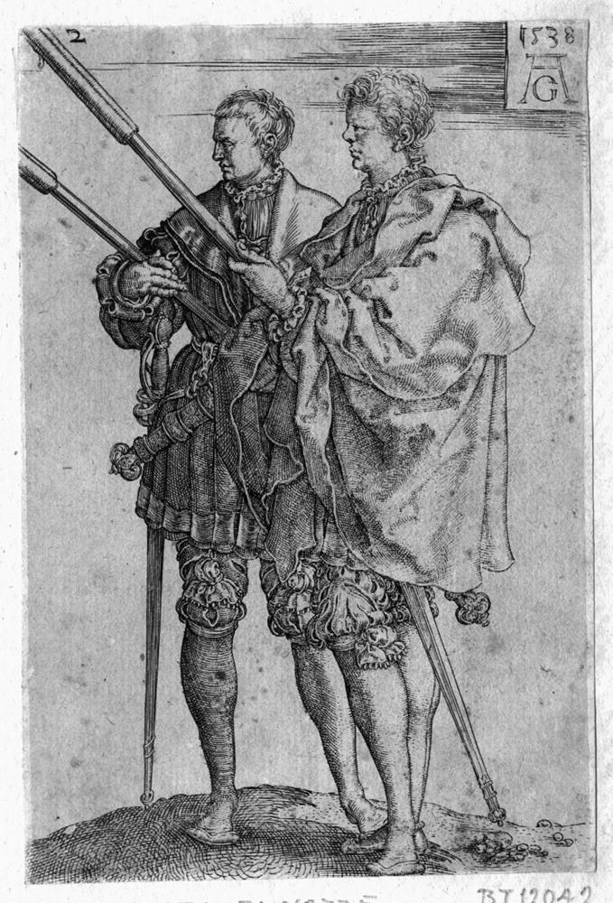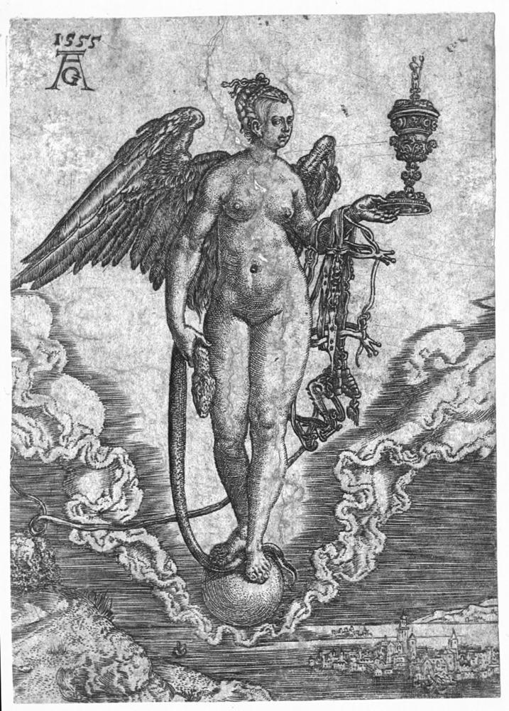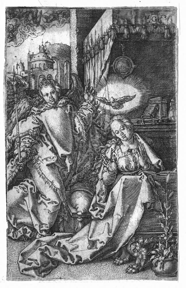 Heinrich Aldegrever LOTTO DI 4 INCISIONI San Giovanni Evangelista. 1539. Bulino. mm 122x78. Hollstein 60. Due portatori di torce. 1538. Bulino. mm 115x77. Hollstein 161. Annunciazione. 1553. Bulino. mm 107x69. Hollstein, 38. Copia in controparte da Aldegrever, Fortuna. 1555 Bulino. mm 108x76. Vario stato di conservazione. (4)