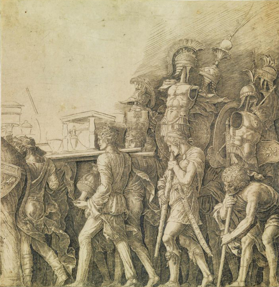 Giulio Campagnola [attribuito a] I PORTATORI DI CORSALETTI Bulino. mm 255x250. Martineau, 123. Da “I trionfi di Cesare” di Andrea Mantegna. Bella impressione stampata su sottile carta vergellata. Rifilata intorno o poco oltre la linea marginale. Alcuni difetti.