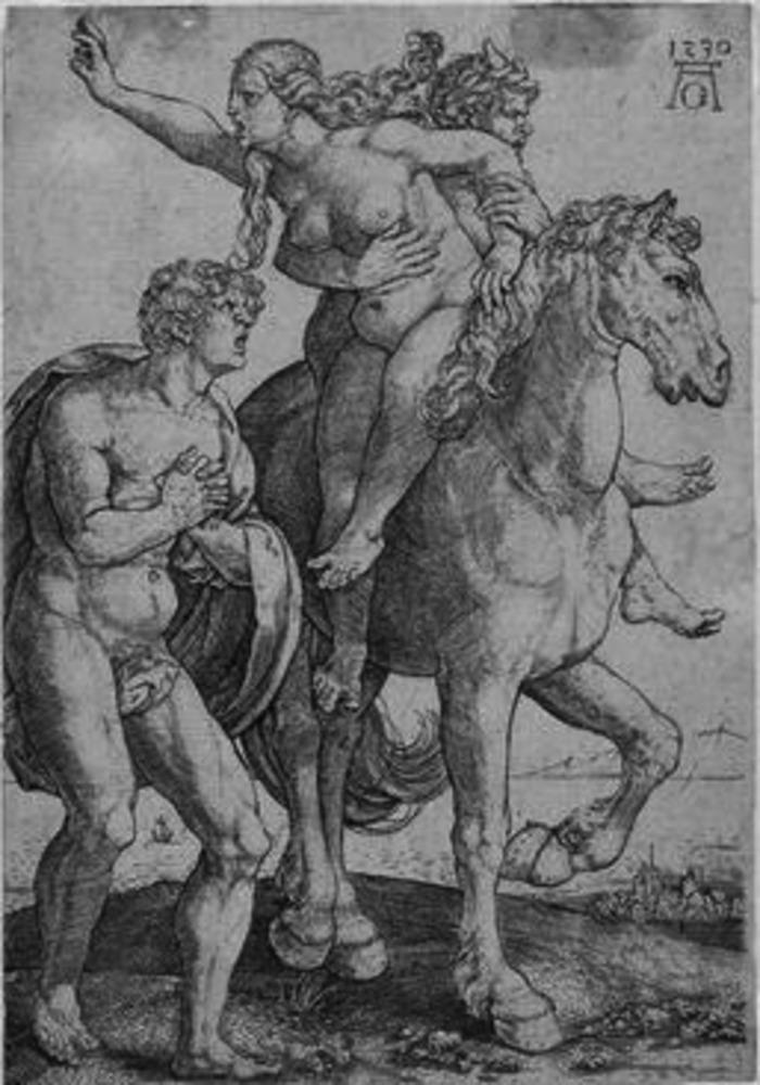 Heinrich Aldegrever IL RATTO DI DEJANIRA. 1530 Bulino. mm 148x104. Monogrammato e datato sulla lastra. Bella impressione. Rifilata intorno alla linea marginale. Reintegro all’angolo inferiore sinistro, tracce al verso di vecchio montaggio.