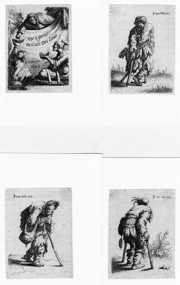 Jan Joris Van Vliet FIGURE DI MENDICANTI. 1632 Serie di 8 acqueforti. mm 90/95x62/67. Hollstein (Flemish) XXXV, 73/77 79/81. Titolo e data incisi sul frontespizio, firma incisa su tutte le tavole. Alla serie furono successivamente aggiunte due tavole raffiguranti personaggi femminili. Frontespizio e 5 tavole nel II stato su 4; 2 tavole nel III stato su 6; 1 tavola nel IV stato su 6. Bellissime impressioni. Margini di 2/4 mm oltre l’impronta della lastra, ottima conservazione. (8)