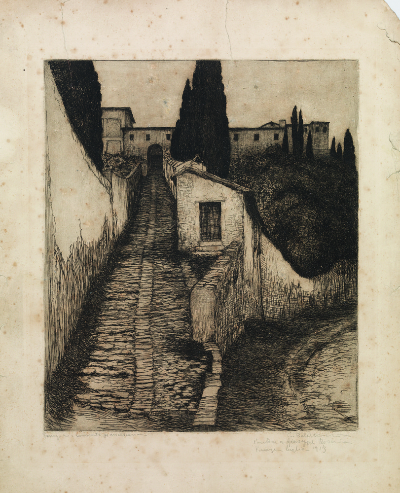 Celestino Celestini PERUGIA. CONVENTO DI S. FRANCESCO. 1909 CA. Acquaforte. mm 313x265. Foglio: mm 440x350. Firmata e titolata a matita. Dedica a destinatario non decifrabile datata “Luglio 1913”. Bella impressione. Grandi margini, alcuni strappi, tracce di foxing ed ossidazione, residui al verso di vecchio montaggio.