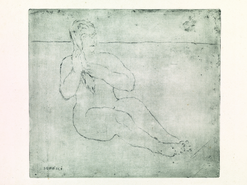 Ardengo Soffici NUDO SULLA SPIAGGIA. 1927/28 Puntasecca. mm 216x245. Foglio: mm 350x497. Bartolini (Soffici), LIXb. Firmata sulla lastra. Tiratura a pochissimi esemplari non numerati e non tutti firmati. Al verso autentica di Maria Adriana Galletti Soffici. Bellissima impressione carica di velatura stampata su carta avorio. Timbro a secco della Raccolta Soffici di Poggio a Caiano e della Libreria Prandi di Reggio Emilia. Grandi margini, lievi pieghe e tracce marginali di foxing.