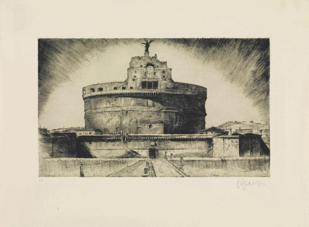 Sepp Frank ITALIENISCHE REISE. 1921 Serie completa di 12 acqueforti e un colophon, entro la cartella editoriale originale. Fogli: mm 457x345. Tutte le tavole sono firmate a matita e contenute nel passe-partout originale. Esemplare n. 76 (di 200). Ottime impressioni. Margini editoriali.