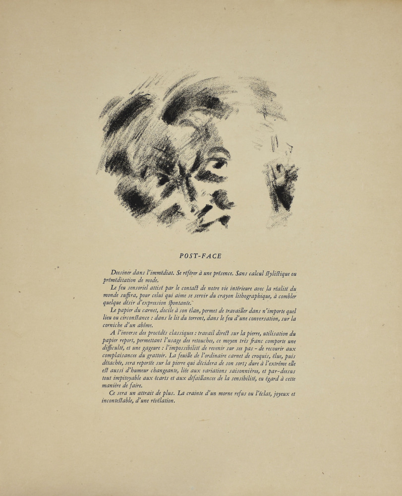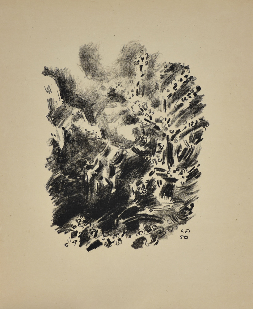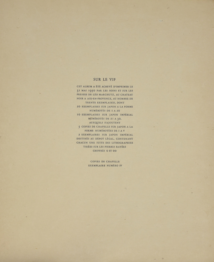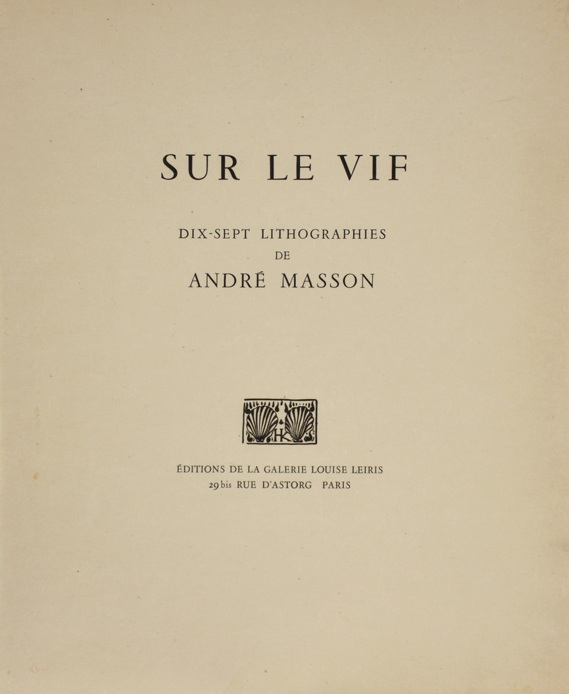 André Masson SUR LE VIF. 1950 Serie completa di 17 litografie in nero entro la cartella editoriale. mm 505x415 ciascuna. Quarto esemplare numerato delle 5 copie de chapelle stampate su Japon à la forme da Léo Marchutz per Éditions de la Galerie Louise Leiris di Parigi il 31 maggio 1950 . Margini editoriali. Alcuni difetti nella cartella.