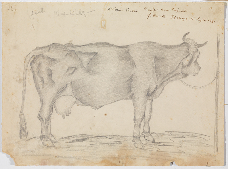 Giuseppe Cesetti MUCCA. 1931 Matita di grafite su carta “Fabriano” ruvida. mm 245x330. Al verso: Un cane seduto guarda l’orizzonte. Matita di grafite. Dedica autografa a penna : “All’amico Primo Conti con simpatia. G. Cesetti Firenze 5 Luglio 1931”.
