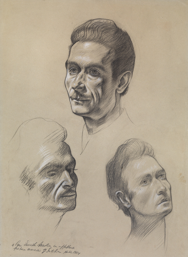 Gregorio Sciltian STUDI DI VOLTO MASCHILE. 1964 Gessetto nero con rialzi a gessetto bianco su carta grigio-verde. mm 487x359. Dedica autografa a destinatario non decifrabile.
